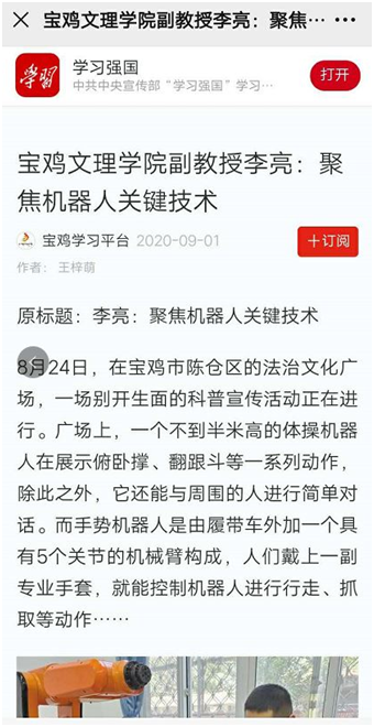 近日,公司副教授、陕西省机器人关键零部件重点实验室副主任李亮博士研发机器人关键技术,引起学习强国、陕西日报、陕西头条等多家媒体的广泛关注和报道。
