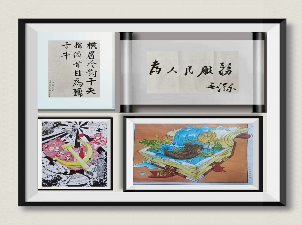 大赛从5月份开始,学院百余名师生积极响应,踊跃参加,用书法和绘画的形式描绘了新民主主义革命时期、社会主义革命和建设时期、改革开放和社会主义现代化建设新时期以及中国特色社会主义新时代不同时期党的光辉历程。大赛经初审,共收集书、画作品100余幅,作品通过剪纸、彩绘、素描、软笔、硬笔等形式或描画红船精神、抗战小故事、长征故事、抗疫精神等,或书写毛泽东诗词、习近平经典语录,表达了师生对伟大祖国、伟大人民的热爱和坚定跟党走的信念。